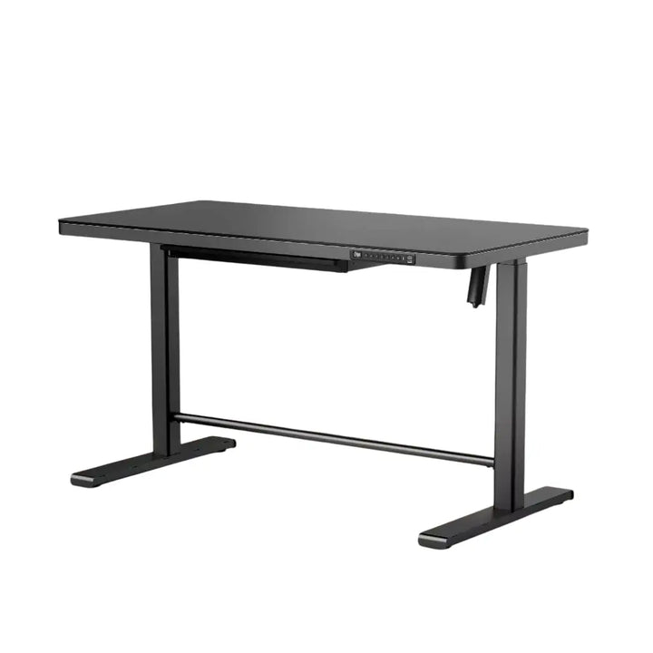 A stylish, glass-top compact sit-stand desk offering premium quality at an accessible price.